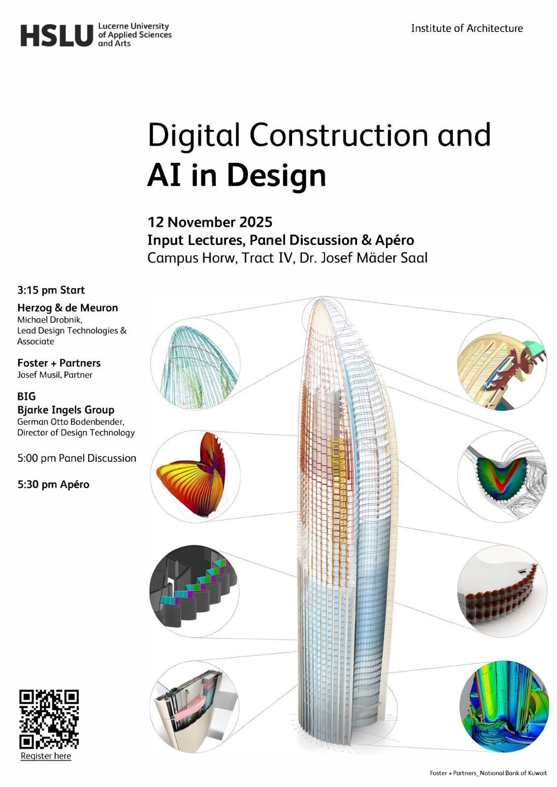 Am 12. November veranstaltet das HSLU Institut für Architektur eine öffentliche Veranstaltung zum Thema „Digital Construction and AI in Design“ mit Gästen von HDM, Foster + Partners und BIG.