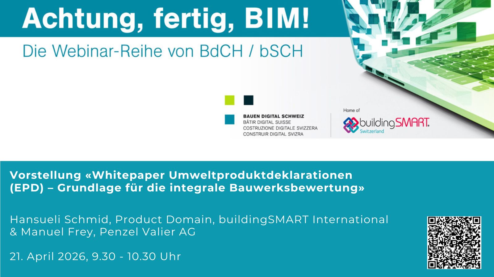 Am 21. April, 9:30 -10.30 Uhr, findet das nächste Webinar unserer Reihe «Achtung, fertig, BIM!» statt: «Vorstellung Whitepaper Umweldproduktdeklarationen (EPD) – Grundlage für die integrale Bauwerksbewertung» Wie gelangen Umweltinformationen strukturiert in digitale Bauprozesse?Das Webinar zeigt, wie Umweltproduktdeklarationen (EPD) und der Digitale Produktpass zusammenspielen und maschinenlesbar in BIM integriert werden. Es...